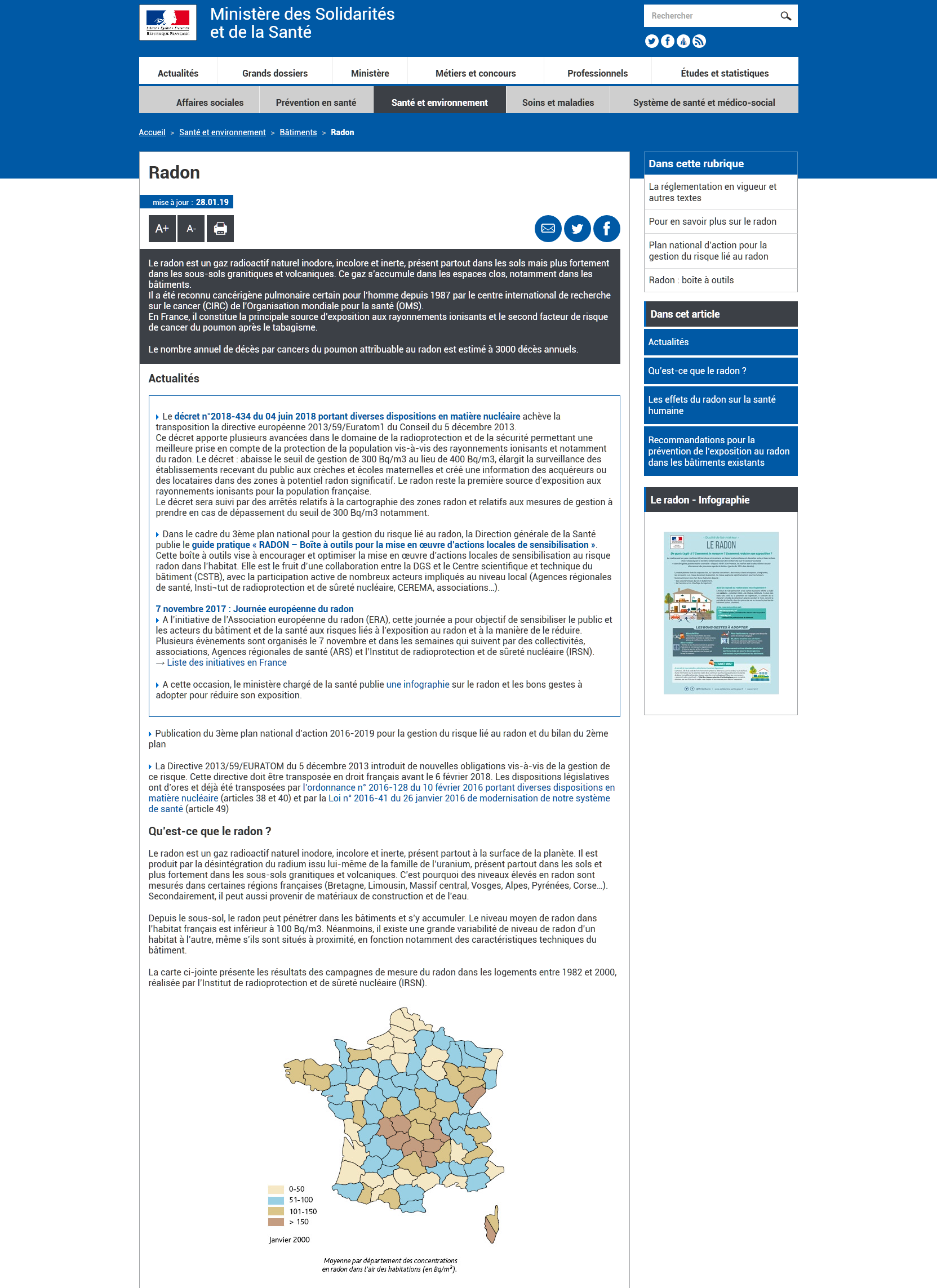 Radon -Site du Ministère des Solidarités et de la SantéPrésentationDonnées sur le radon du Ministère des Solidarités et de la SantéPublié visé : TousNiveau de vulgarisation : Tout publicDate d'édition :Auteur / Organisme : Ministère des Solidarités et de la SantéPublié le :